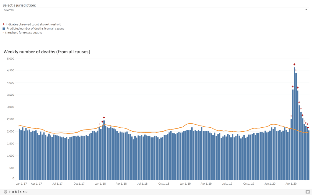 Those scientists anticipated that a certain percentage of the population would contract the virus but never develop significant symptoms, but had to work from the best numbers they had until such testing was actually available. And it’s a very good thing that those assumptions were correct, since the original case fatality rates we were seeing were in the civilization ending range of 8-15% in certain countries. If antibody testing had been developed and found only a negligible amount of asymptomatic and minimally symptomatic cases, it would be devastating news for everyone; not least for the doctors, nurses, epidemiologists, and others who have turned their lives upside down to fight the pandemic. Accounting for asymptomatic and minimally symptomatic cases would clearly yield a much lower death rate, but still firmly in the very, very dangerous range. For instance, large scale antibody testing in New York in April found antibodies in 13.9% of the population (WBUR has an excellent article picking through the wildly varied estimates of asymptomatic cases) , which reduced their overall estimated fatality rate from 6% to 0.5%. Many current estimates place the overall fatality rate between 0.5% and 1.3%. For a virus this contagious, these are still scary numbers. Even here at the end of June, many people are still wanting to compare this to the flu to dismiss the danger, even though these much lower death rate estimates are still 5 to 13 times higher than seasonal influenza’s commonly accepted 0.1% fatality rate, and even though the flu itself regularly threatens to overwhelm our healthcare systems. Please keep in mind that this is at best an apples and oranges comparison. We don’t routinely measure influenza antibodies to determine the percentage of asymptomatic cases, focusing instead on those who are symptomatic, and our death rates for flu are based on a totally separate set of calculations (I talked about this in more detail in my response to the Bakersfield Urgent Care doctors). If you want to compare oranges to oranges we can look at excess mortality for both viruses. Consider the graph below from New York State: the first cluster of red crosses is the peak of the 2017-2018 flu season, the worst flu season I have experienced since starting medical school; the second is COVID-19 during New York’s surge in April.