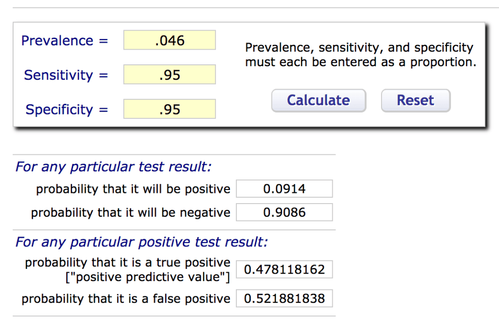 Calculating positive predictive value based on prevalence can be done with just a few numbers (test sensitivity, test specificity, and prevalence) and the simple equation PPV = (sensitivity x prevalence) / [ (sensitivity x prevalence) + ((1 – specificity) x (1 – prevalence)) ] (Um, there’s also an online calculator if you’d rather follow along that way), and it’s always shocking to me how quickly the lab error for even very good tests becomes relevant when the prevalence of a disease is low. Most manufacturers rate their antibody tests in the extremely accurate range of 95-100% for both sensitivity and specificity (because of course they do); some have performed well in independent testing, but others not so much. Let’s use the online calculator (or the equation above, if you just really like that sort of thing) and plug in a few of these numbers.