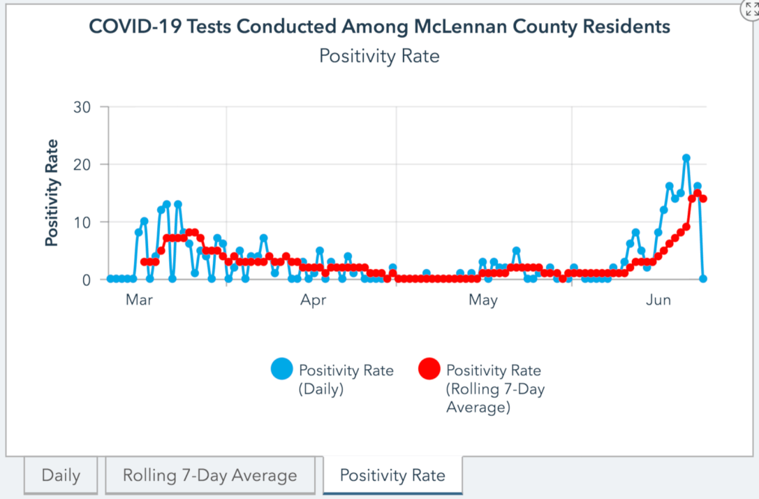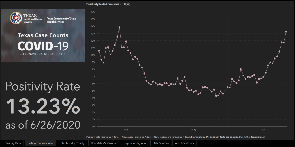 The first number is the percentage of positive tests.Ever since testing became more widely available in April and we were able to shift away from testing only those with a high likelihood of having the disease and/or of developing complications, we have been testing essentially the same types of cases; people with some combination of cough, shortness of breath, fever, loss of taste and smell, etc. and/or known or suspected exposure to the virus. There are many causes of these types of symptoms, from allergies to other respiratory viruses to chronic conditions like asthma and COPD, and in our pre-surge days these explained the symptoms in the vast majority of people we tested. If you look at the Texas testing data from April you will see two things; an overall low number of tests (a very modest 5-10k per day) and a fairly high percentage of tests that are positive, between 10-14%. This reflects our very strict testing criteria at that time; we were only testing the people we already really thought had it. In late April and all through May we see an ever increasing number of daily tests and a falling rate of positive tests, a reflection of liberalizing testing criteria and strong evidence of overall low prevalence in our State. Throughout June, and especially over the last 2 weeks, we continue to see an increasing number of tests each day; but we are now also seeing our percentage of positive cases rising again. This isn’t because we’ve tightened up or restricted our testing criteria again; it’s because more people actually do have the virus.
