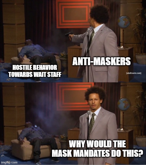 I realize that there is at least one other possible interpretation, but it’s so cynical- and so transparently flawed- that I wasn’t willing to lead with it. They could be saying, “look at how these masking and social distancing measures have resulted in violence and hostility towards people in the service industry! We need to end these mandates so that people don’t have to experience this hostility any more!“ If you find that argument compelling I’m not really sure what I can tell you. It seems blaringly self-evident that the responsibility for deciding to respond with hostility, intimidation, and violence towards employed individuals simply enforcing the policies of their state, city, or place of business rests solely with the person choosing to respond that way. Placing the blame on the policies themselves and absolving those doing the bullying of any culpability is obtuse in the extreme, and while I am sure some of their readers will take this data that way, I don’t really think it’s what First Trust meant in including this data.