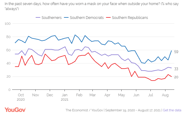 If you live in Texas (as I did until very recently), what might jump out at you from this data is the idea that up until May 70-80% of people were wearing masks indoors consistently when they left their homes.I’m not sure if you’ve been to the grocery store in Texas recently, but that number seems… High. Without a statewide mask mandate, I have frequently been inside of a place of business where I was the only person wearing a mask, and at best the numbers seem split about 50/50. Again, my personal experience might not be normative; we have to look at the data, which in this case comes from YouGov.com online poll data.