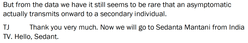 5:32 “That equates to 4.7 million cases in the state of California.” (No epidemiologist believes this; this is a nonsense number.)