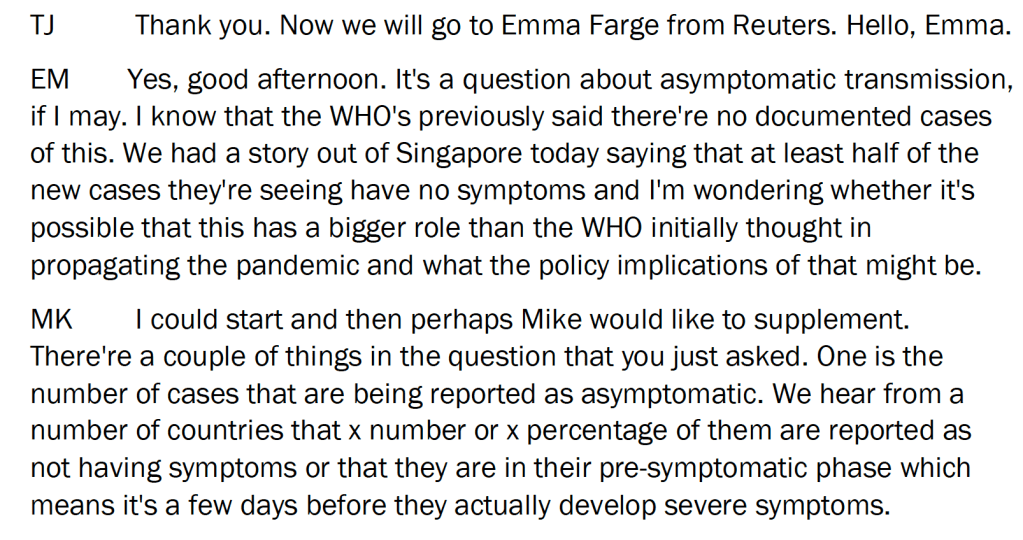 It’s also an important opportunity for demonstrating some intellectual integrity, since the reporter is correct that those models were for scenarios where social distancing wasn’t followed, and Dr. Erickson has been dismissing them as ‘wildly inaccurate’. Sadly he fails to rise to the occasion and acknowledge this.