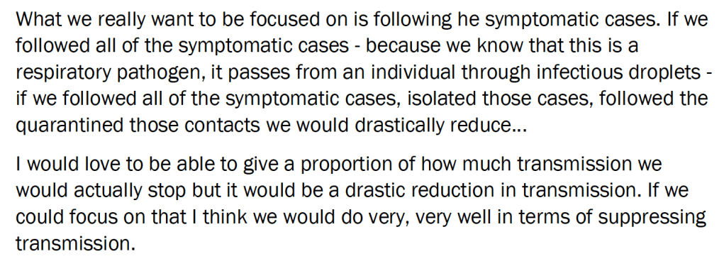 This data can’t be used for the purposes he is trying to use them for, for at least three very compelling reasons. First, it’s the wrong testing strategy. He keeps saying you can extrapolate the test data we have to the general population, but the people who were tested do not represent the general population. They have self selected due to exposure or illness and, especially early on, had to meet very strict criteria (or be an NBA player or celebrity) to even get tested in the first place because of the shortage of tests; these tests were done on the people who were already the most likely people to have COVID-19, and so their percentage of positive tests (39% in New York, 12% in California per Dr. Erickson) is going to be far higher than any other group. Even accounting for asymptomatic carriers, there is no reason to believe that asymptomatic people would have the virus at anywhere near the rate of people who have symptoms of the virus. This is… pretty common sense stuff, actually. For testing to be used to extrapolate to large numbers that give us population level data, it has to be random, and this is the opposite of random. So it’s the wrong strategy for the conclusions he is drawing.