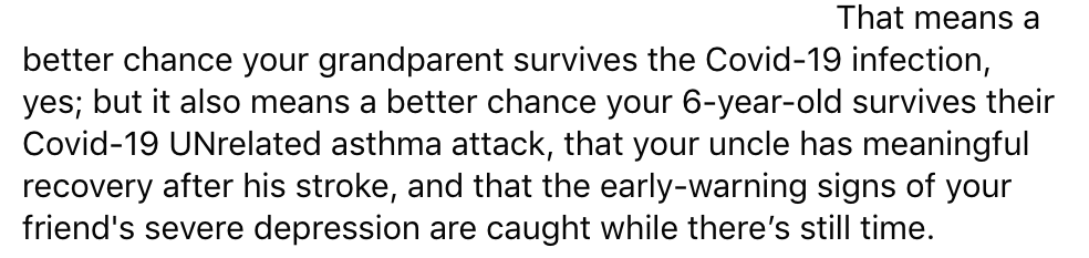I do think this doctor can be wrong, and yes, do damage, without it being nefarious. But it’s clear from social media that there are some people, perhaps many people, who are not comfortable with the majority of physicians drawing one conclusion while a small minority draw the opposite conclusion unless one of those groups is lying. If that’s you, please consider which doctors have the greater financial motivation to build a false narrative- and stand to actually gain from the narrative they are building- and which are willing to tell the truth to keep you safe even if it potentially hurts them financially. That’s already one of the most obvious ethical principals we nevertheless have reinforced for us repeatedly throughout medical school and residency and a decision that a great many of us got used to making years ago anyway, and the idea of a doctor telling his patients “please stay home and stay safe” as he wonders how he’s going to pay the rent on his clinic building is far easier for me to imagine than any of the critical care doctors I’ve met in the last 13 years intubating a patient that they thought didn’t really need to be on a ventilator, much less because it was going to make them some extra money.